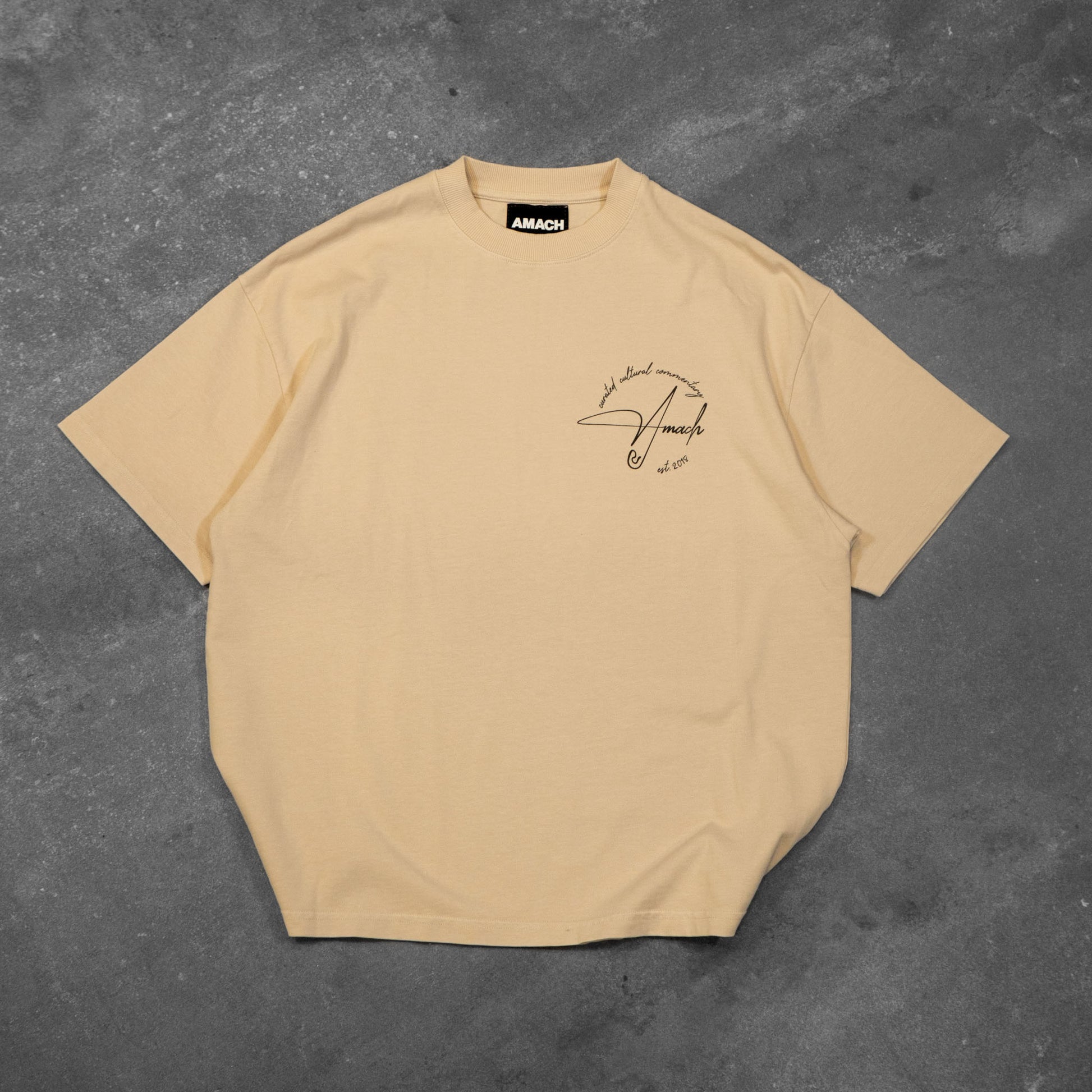 AMACH Signature Tee. Our heavy weight Jersey, premium cotton t-shirt. With Screen-printed Signature Graphics front and back. This piece is pre-shrunk, garment dyed, and box fit.